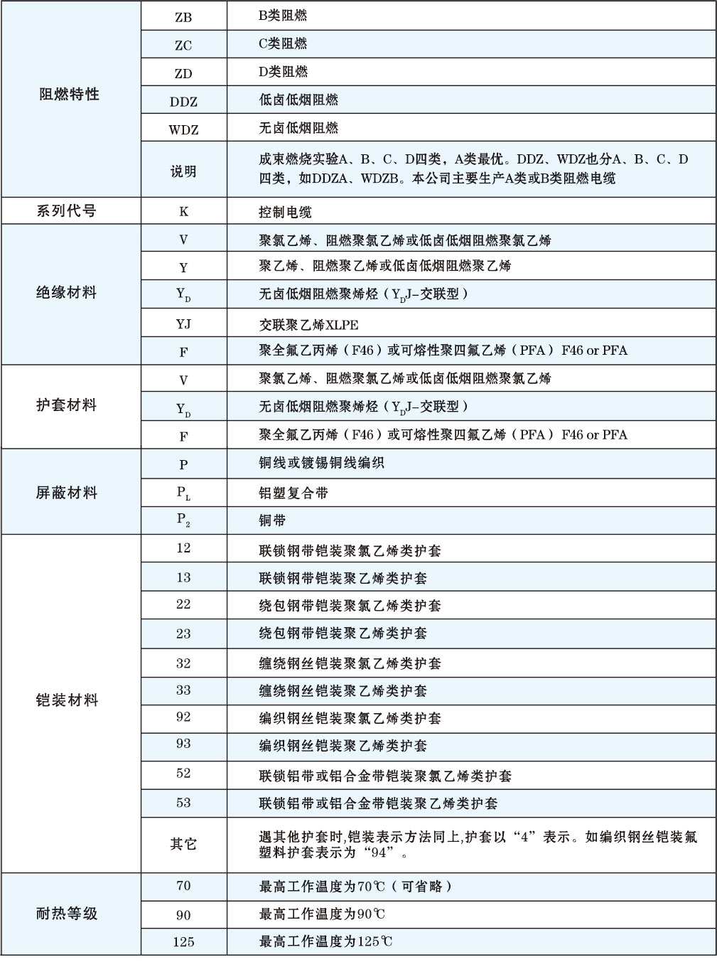 注:根據(jù)上述所例電纜型號說明,可以選擇各種組合以滿足需要。