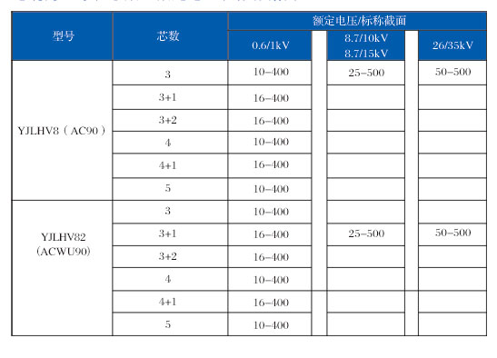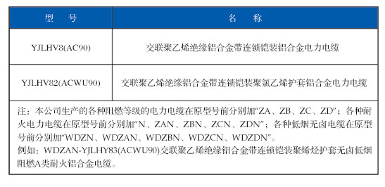 緊壓絞合鋁合金導體、阻燃交聯(lián)聚乙烯絕緣、軋紋聚酯帶繞包、鋁合金帶連鎖鎧裝護套、5000V及以上采用內(nèi)、外屏蔽層。