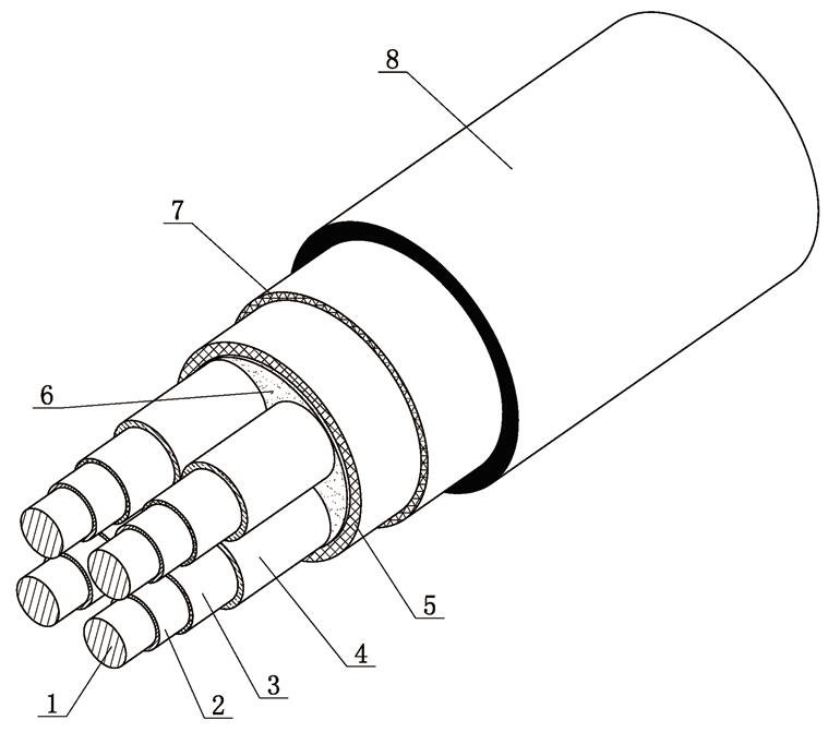 如圖1,一種帶有鋁合金隔離層的礦物質(zhì)絕緣柔性隔熱防火電纜,是設(shè)有多個(gè)導(dǎo)體線(xiàn)芯1的多芯電力電纜;在每個(gè)所述導(dǎo)體線(xiàn)芯的外徑由內(nèi)到外包裹有礦物質(zhì)絕緣層2,鋁合金隔離層3,分色層4,多個(gè)包裹有絕緣層、鋁合金隔離層和分色層的所述導(dǎo)體線(xiàn)芯由一個(gè)礦物質(zhì)防火隔熱層5包裹,在所述礦物質(zhì)防火隔熱層與所述分色層之間的空隙填充有阻燃填料6,在礦物質(zhì)防火隔熱層的外徑上包裹玻璃絲阻燃帶7,在所述玻璃絲阻燃帶的外層擠包有阻燃護(hù)套8。