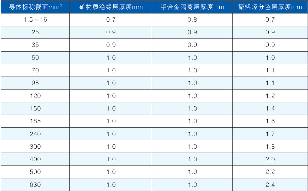 導(dǎo)體線(xiàn)芯的截面積、礦物質(zhì)絕緣層厚度、鋁合金隔離層的厚度和分色層厚度的關(guān)系表如下: